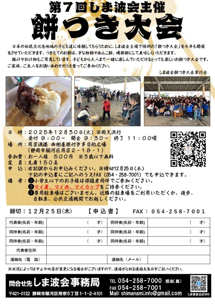 日時:2025年12月30日 時間:09:00~11:00第7回しま波会主催「餅つき大会」 -